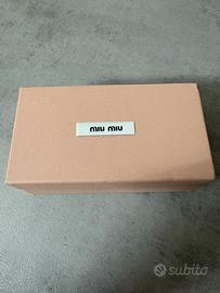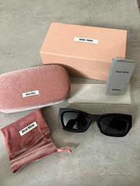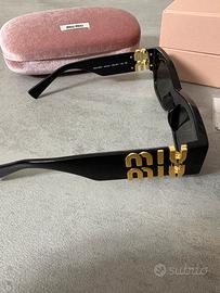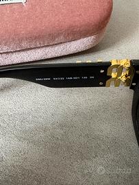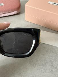 Eleganti occhiali da sole Miu Miu con dettagli dorati acquistati a San Marino ma non mi trovo. - Montatura squadrata. - Logo Miu Miu sulle aste. - Lenti scure.