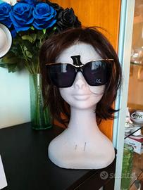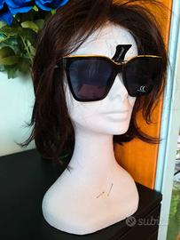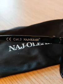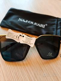 Occhiali da sole con montatura nera lucida in plastica e profilatura superiore dorata. Lenti scure trapezoidali CAT. 3, adatte per la protezione degli occhi dall'esposizione alla luce solare . Marchiati Naj Oleari sulla stanghetta interna e sulla custodia. Nuovi. Mai usati. Forniti di foglietto descrittivo e custodia in stoffa. Naj Oleari .