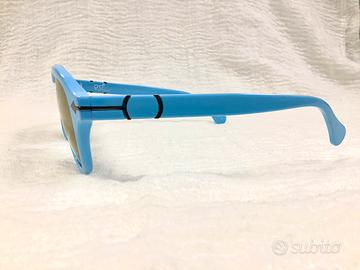 Montatura azzurra con lenti specchiate dai riflessi bronzei.