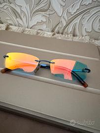 occhiali da sole police sono un modello unisex senza montatura (rimless) con lenti rettangolari e presentano una colorazione sfumata o specchiata che vira dall'arancione/rosso al blu/verde. Usate poco nb manca custodia originale