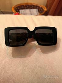 Vendo occhiali da sole Prada originali, modello oversize a forma squadrata. Montatura nera frontale con aste fantasia tartarugato, lenti scure.