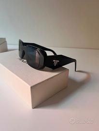 Occhiali originali Prada con montatura squadrata nero lucido e lenti grigie. Logo Prada sulle aste. Misura 49|20|145. Vendo con scatola e certificato originali. Indossati pochissimo, come nuovi.