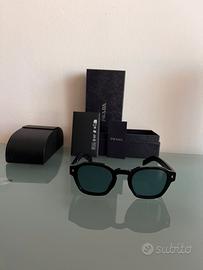 Vendo occhiali da sole Prada da uomo per inutilizzo, modello di lusso con lenti azzurre e rifiniture in oro, dal design elegante e moderno.
