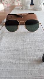 Occhiali Da Sole Ray-Ban Esagonali originali con montatura oro e lente verdone. Ottimo condizioni e presenti di custodia originale. non presenta segni di usura, ci sono solo piccolissimi puntini su una lente che però non sono visibili quando s'indossano gli occhiali.