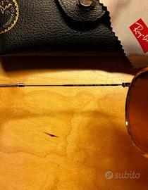 Originali RayBan. Lente sfumata marrone, montatura oro, e rosa latte. Indossati pochissimo perché non mi convincono molto sul mio viso. A differenza dell’occhiale che risulta immacolato la custodia ha il bottone clip precario perché ho sostituito la sua custodia nuova con una di un altro paio rayban che utilizzo spesso.