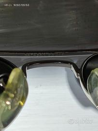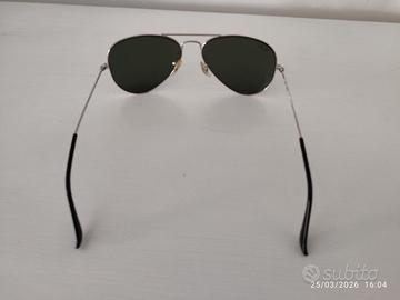 Vendo bellissimi occhiali da sole Ray-Ban originali, mod. RB 3025 Aviator large metal W 3275, taglie 55-14, lenti verdi di categoria 3N, protezione 100% agli ultravioletti. Gli occhiali, hanno montatura e stanghette colore acciaio con la parte a contatto con le orecchie in plastica e sono leggerissimi; sono completi di panno per lenti con il logo, custodia rigida originale, in similpelle di colore nero con logo. Indossati pochissime volte, praticamente sono come nuovi. Veramente un ottimo affare.