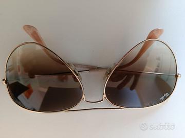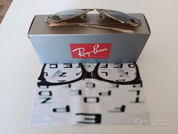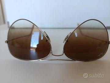 Marca Ray Ban, modello a aviatore, taglia 55/14/135, montatura dorata, lenti originali marroni a sfumare. Disponibile con scatola originale e panno pulizia lenti (non originale). No custodia!