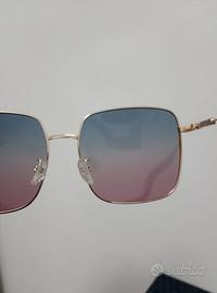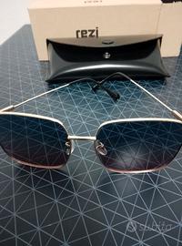 Occhiali da sole Rezi, Nuovi, con lenti sfumate dal blu al rosa. mai indossati La montatura è dorata (colore oro) e le lenti hanno una forma squadrata. Lenti sfumate blu rosa Inclusi custodia protettiva.