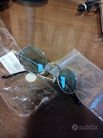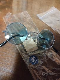 Occhiali da sole rotondi con montatura color argento e lenti verdi, ispirati allo stile dei Beatles.