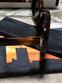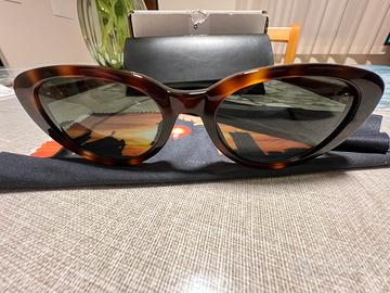 Occhiali da sole da donna. Occhiali cat-eye arrotondati con montatura in acetato tartarugato, lenti in nylon e aste con logo in oro. Sono nuovi, mai indossati.