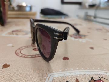 Occhiali da sole donna senza brand, montatura grossa scura, sul marrone. Buone condizioni. Apparentemente non presenti difetti o imperfezioni nelle lenti. Piccoli segni di usura nelle stanghette lato interno. €5