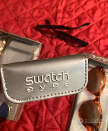 6 modelli di originali occhiali da sole Swatch Eyes vintage anni ‘90 e un supporto nero in plastica su cui applicare le lenti, confezioni originali