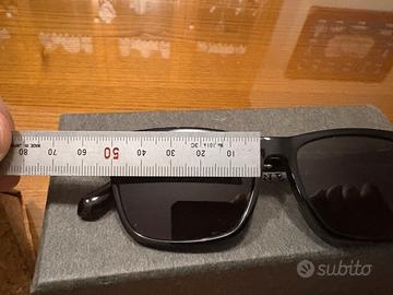 Occhiali da sole molto particolari, stecche in legno, lente verde Non sono molto grandi, ho messo le misure per orientarsi.
