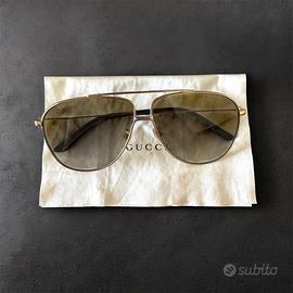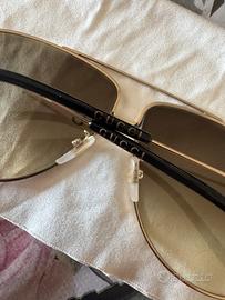 Vendo splendidi occhiali da sole Gucci originali, con montatura in metallo dorato e lenti sfumate marroni. Un accessorio di alta moda, elegante e intramontabile, perfetto sia per uomo che per donna.