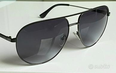 Occhiali da sole Guess stile Aviatore con doppio ponte, montatura in metallo colore argentato e nero, lenti in policarbonato grigie, larghezza lenti 62 mm, ponte 14 mm, stanghette 145 mm.
