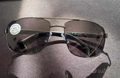 Occhiali da sole con montatura in metallo color brunito e lenti scure. La custodia protettiva è inclusa.
