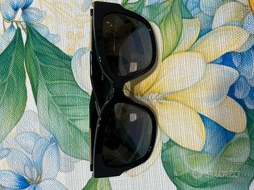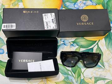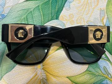 Splendido paio di occhiali da sole Versace originale (Modello VE4437U), caratterizzato da un design audace e iconico. La montatura nera è arricchita sulle aste dalle celebri Meduse dorate in rilievo su placca quadrata, un dettaglio di lusso inconfondibile. Caratteristiche Principali: • Modello: VE4437U GB1/T3. • Lenti Speciali: Questo modello monta lenti Polarizzate (3P) grigio sfumato. Ideali per eliminare i riflessi, migliorare il contrasto e proteggere gli occhi al 100% dai raggi UV. • Design: Montatura oversize moderna in acetato nero di alta qualità. • Condizioni: [Inserisci qui le condizioni, es: Ottime, usati pochissimo, senza graffi sulle lenti]. • Produzione: Made in Italy. Misure: • Larghezza lente: 54 mm • Lunghezza aste: 140 mm