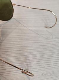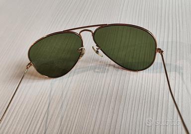 Ray-Ban Aviator vintage by Bausch & Lomb USA. Montatura dorata con aste sottili a filo ricurvo. Lenti verdi classiche G-15 in vetro minerale, verde bottiglia , qualità B&L . Marcature originali incise sulla montatura e lenti (come da foto). Lente sx con piccola scheggiatura (foto).