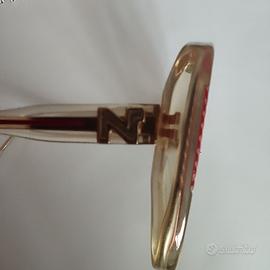 Occhiali da sole Vintage Nina Ricci 6238 – Fumé – Made in France – Anni 80 Raro pezzo d'archivio Nina Ricci Paris, modello 6238 originale degli anni '80. Realizzati a mano in Francia. Descrizione del Prodotto Brand: Nina Ricci Paris (Vintage Originale). Modello: 6238. Periodo: Anni '80. Produzione: Handmade in France. Stile: Glamour Chic / Butterfly. Una montatura leggera ma di grande impatto, con un design che solleva lo sguardo. Dettagli Estetici: Il frontale e le aste presentano una lavorazione a "intreccio" dorato con inserti smaltati bordeaux/tartarugati. È uno stile che richiama l'eleganza classica della "rive gauche" parigina. Lenti: Lenti da sole originali fumé (sfumate). Questa colorazione era molto in voga negli anni '80 perché protegge dal sole ma permette una visione chiara e confortevole anche in ambienti meno luminosi.