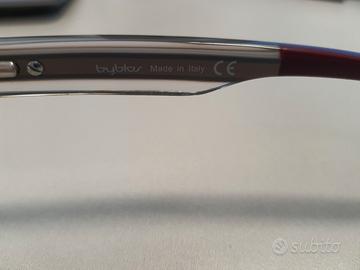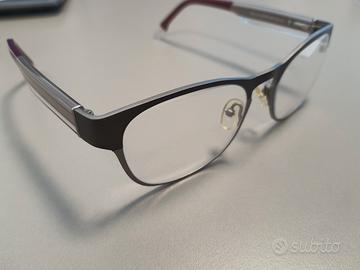 Stanghette in acetato trasparente e bordeaux, montatura lenti in titanio verde oliva e argento, leggeri e comodi.