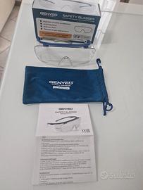 Vendo Occhiali di Sicurezza per Lavoro (Nuovi), Marca GENYED, Protezione Alta UV400, Lente Anti- appanamento, Lente Anti- graffio, Regolazione dell angolazione delle tempie. Adatto per essere indossato sopra gli occhiali da vista. Dimensioni Lunghezza 150 mm, Larghezza 52mm.