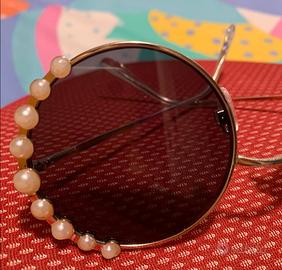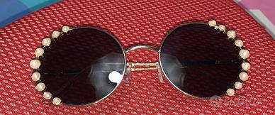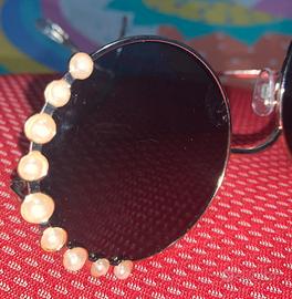 Occhiali Donna,da Sole H.M, Rotondi,Neri,con Perle,Montatura Color Oro.