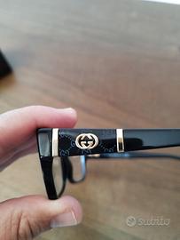 Occhiali da vista Gucci in celluloide neri. Si possono usare anche come occhiali da sole mettendo lenti scure/colorate. Montatura in ottime condizioni, usata un paio di volte. Con scatola monogrammata marrone e panno pulisci lenti