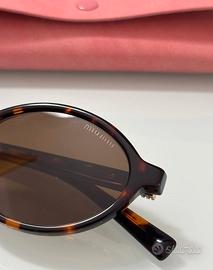 Nell’immagine si vedono degli occhiali da sole con montatura scura e lenti marroni appoggiati su un tavolo chiaro. Accanto ci sono la scatola rosa, la custodia e il panno per la pulizia, tutti con il logo “miu miu”. Lo stile è elegante e delicato.