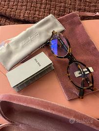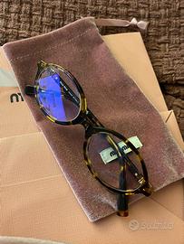 Occhiali MiuMiu con lenti non graduate, filtro luce blu. montatura tartarugata. Completi di confezione originale, porta occhiali rigido, sacchetta e accessori.