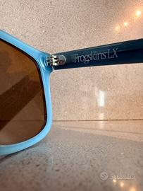 Occhiali Oakley Frogskins xl con frontale e aste avana e interni azzurri. Lenti polarizzate e vestibilità oversize Lenti leggermente rovinate si possono sostituire Montatura leggermente scolorita come di vede in foto