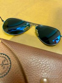Occhiali Ray-Ban Aviator 3025 taglia L, con cuatodia in pelle. Montatura color titanio e lenti verdi