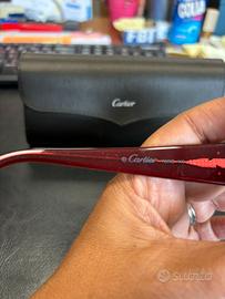 Occhiali da sole originali. Linea Signature C de Cartier nuovi, in acetato rosso bordeaux. Lenti bordeaux sfumate. Mai usati. Con certificato di garanzia, scatola originale in perfette condizioni, custodia e panno in microfibra Cartier. Logo C di cartier dorato sulle aste (140 mm). Elegantissimi. Un gioiello iconico senza tempo nel perfetto stile Cartier.