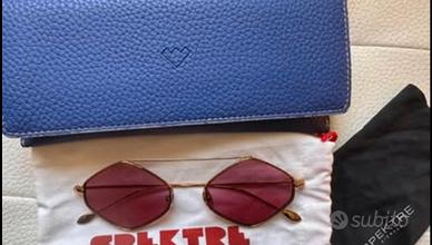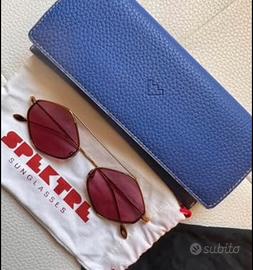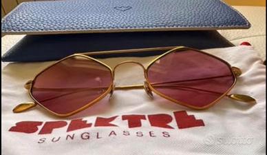 Occhiali da sole originali,forma a rombo con montatura oro e lente burgundy venduti con la sacca porta occhiali, contenitore e pezza in microfibra per la pulizia delle lenti, tutto marchiato.