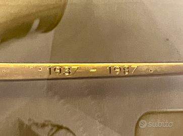 Ray-Ban ‘The General’ 50* anniversario 1937 / 1987, lenti in perfette condizioni, completi di custodia originale e garanzia originale ma senza sigillo, leggermente smangiati in due piccoli punti della montatura per il loro uso, acquistati personalmente nel 1987. Tutto rigorosamente originale, prodotti per il cinquantesimo anniversario, un pezzo di storia.