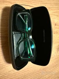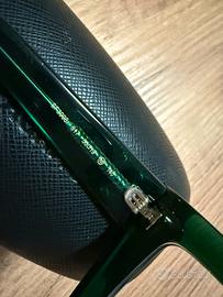 Telaio in plastica (acetato) verde trasparente con dettaglio marchio in oro.