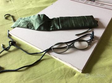Occhialino a due lenti con breve manico e cordoncino da portare appeso al collo. Montatura scura blu/ verde di materiale plastico elegante, di qualità. Detto in francese "lorgnette". Le lenti servono per guardare da vicino. Moderno, fatto fare presso un ottico per affrontare in modo originale i primi sintomi di presbiopia, senza ricorrere agli occhiali tradizionali. Lenti di ottima qualità. Con astuccio contenitore leggermente imbottito.