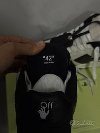 Sneakers Out of Office bianche e nere con freccia nera laterale. Etichetta Zip-Tie nera con bordi bianchi. Punta traforata. Logo Off-White™ bianco sullo sperone e sul sottopiede. Suola in gomma. Chiusura con lacci e scritta "SHOELACES" nera.