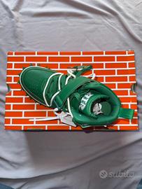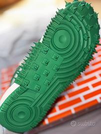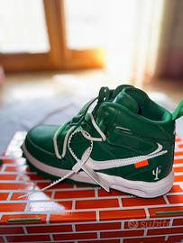Queste Air Force 1 Mid presentano una tomaia in pelle di alta qualità , con il caratteristico design Off-White che include dettagli come la scritta "AIR" sulla suola, la linguetta in nylon arancione e il celebre zip tie. Il verde pino aggiunge un tocco unico e originale, facilmente abbinabile con diversi outfit.