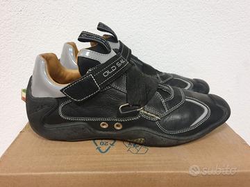 Scarpe uomo marca OLD SAIL mod. WINCH 143, n. 39, sneakers da barca. In pelle di colore nero ed inserti in grigio, con allaccio a strappo incrociato. Usate, ancora in buonissime condizioni, come da fotografie allegate. Originali, acquistate anni fa a Milano in via Montenapoleone.