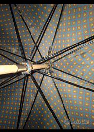 Il tessuto esterno, impermeabile e di alta qualità, presenta un motivo geometrico o microfantasia a piccoli rombi o puntini, nelle tonalità blu e ocra/marrone, tipico delle fantasie classiche di Giorgio Armani. Le rifiniture dei bordi sono in tinta coordinata, esaltando ulteriormente l’aspetto raffinato dell’ombrello.