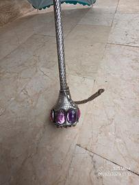 Impugnatura cesellata con cristalli, leggermente ammaccata.
