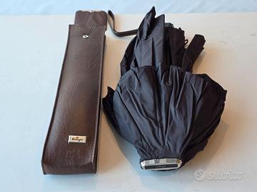 Ombrello Knirps vintage completo di elegante custodia rigida in pelle marrone con logo metallico. Meccanismo compatto, struttura robusta e tessuto nero in buone condizioni generali. Oggetto di qualità, tipico della produzione Knirps, ideale come accessorio d’epoca o per uso quotidiano. Normali segni del tempo sulla custodia, coerenti con l’età.
