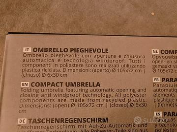 Ombrello pieghevole compatto North Sails, nuovo con cartellino, mai usato. Modello: Compatto e leggero, perfetto da tenere in borsa o nello zaino. Colore beige/tortora elegante. Caratteristiche: Apertura e chiusura automatica con pulsante sul manico. Tecnologia windproof (antivento) resistente alle raffiche. Sostenibilità: Realizzato con materiali riciclati (tessuto in poliestere riciclato), una scelta ecologica e di qualità. Misure: Diametro aperto 105 cm, altezza aperto 72 cm. Chiuso è molto compatto: 30 cm di lunghezza. Confezione originale inclusa. Un accessorio utile, robusto e di marca, ideale anche come regalo.