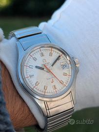 Quadrante: Originale, bianco con indici in rilievo applicati e gli elementi arancioni molto caratteristici che definiscono il design di questo modello: l'anello dei minuti, la lancetta dei secondi e l'iconica ancoretta, simbolo del modello Admiralty, dipinta a ore 6. Quadrante patinato uniformemente, vetro Originale logato Omega al centro, con lente ciclope sulla data, un dettaglio estremamente raro.