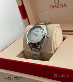Negozio LuxOrient watches Rimini vi propone orologio Omega Aqua terra 28mm ref. 22010286055001 con quadrante madre perla e diamanti, nuovo mai indossato del 2022 full set.