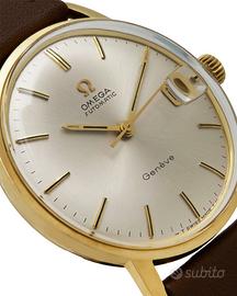 Omega Classic automatic genève oro 18kt cal 565 34mm ; Peso: 39.41; Misura: 15/20; Anno: 1960 (circa); Corredo: Scatola e Garanzia del rivenditore; Referenza: 166.037; Carica: Automatico; Calibro: 565; Rubini: 24; Colore quadrante: Argento; Corona: Oro giallo; Diametro cassa: 34mm; Ghiera: Oro giallo Materiale cassa: Oro giallo; Materiale cinturino: Pelle; Vetro: Plastica. Cod: 7156-a