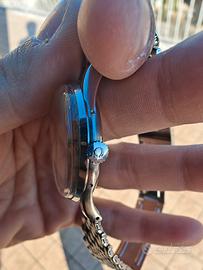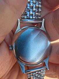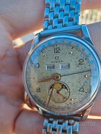 L'Omega Cosmic è stato introdotto nel 1947 ed è rimasto in catalogo fino al 1956 come l'orologio più prestigioso del catalogo del marchio. Questo esemplare è una referenza 2471-1 in acciaio inossidabile, misura 35 mm e ospita il movimento Omega Calibro 27 DL PC basato su Lemania. Il quadrante presenta le finestrelle del giorno e del mese nella metà superiore e una fase lunare all'interno del grande quadrante dei secondi nella metà inferiore. La cremagliera esterna del quadrante è caratterizzata da un'impressionante minuteria blu per la data. Le lancette a foglia sono tutte in ottime condizioni, così come la lancetta della data in acciaio azzurrato - il quadrante ha sviluppato una patina forte e calda. CASSA: buone condizioni generali, con alcune tracce d'uso Cassa in acciaio inossidabile a 3 corpi con fondello a scatto 35 mm (senza corona) / 43 mm (da ansa a ansa) / 18 mm (tra le anse) Riferimento: 2471 - 1 Anno: 1947 MOVIMENTO: Omega Cal. 27 DL PC 17 rubini, 18000 A/h, 44 riserva di carica. assistenza professionale in 2023. 6/ 290 QUADRANTE: quadrante crema originale mai toccato, in buone condizioni Lancette, quadrante e corona originali ha sviluppato una patina uniforme e calda su tutto il quadrante. *bracciale escluso