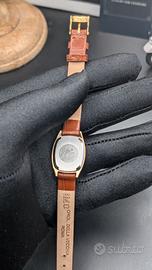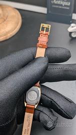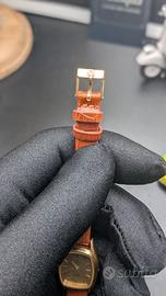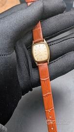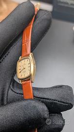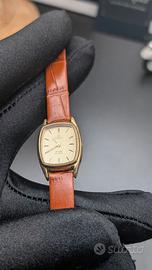 Elegante Omega De Ville Quartz vintage da donna, con cassa dorata e raffinato quadrante champagne con texture a griglia. Un modello classico anni ’70/’80, molto armonioso e facile da indossare.