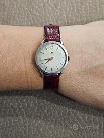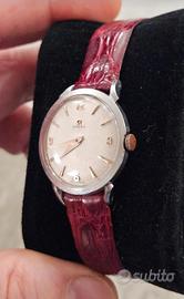 Orologio Omega vintage, da donna, risalente agli anni 50, cassa da 28mm, movimento meccanico a carica manuale, calibro Omega 244, 17 rubini. Quadrante originale con lavorazione waffle. Vetro senza graffi è cinturino nuovo mai indossato. L'orologio funziona perfettamente ed è molto preciso. Venduto come orologio d’epoca da collezione. NOTA BENE, VENDO SOLO A MANO, ZONA ROMA E CASTELLI ROMANI.