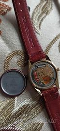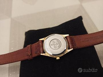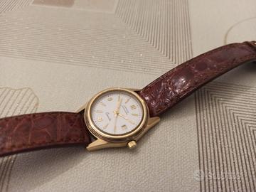 Perfettamente funzionante, in ottime condizioni,cassa placcata oro, da 25mm, corona marchiata come il fondello, cinturino non originale ma sostituito con uno altrettanto di alta qualità marchiato Lorenz, in vera pelle di coccodrillo color marrone.